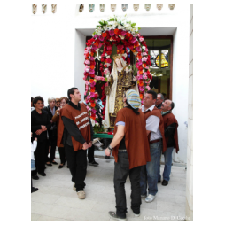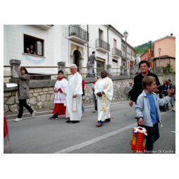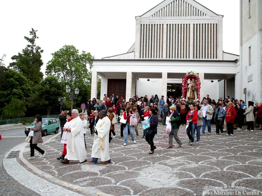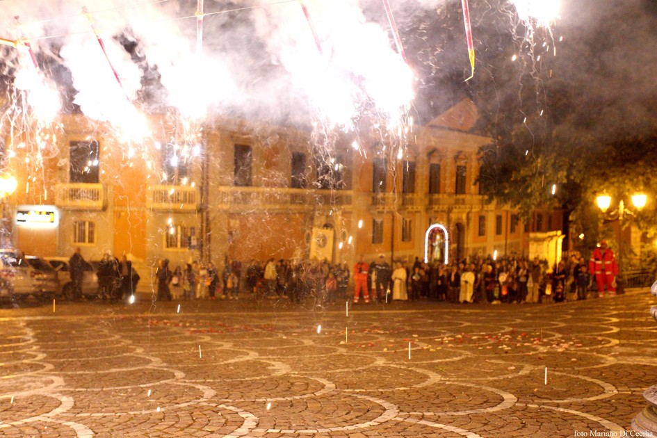 Le ombre della sera cominciano ad allungarsi sul paese e, dopo la consueta Messa, la processione è pronta per iniziare: la statua della Madonna è sistemata nell’apposita nicchia, riccamente addobbata da devote e devoti con tanti tipi di rose e fiori ed illuminata da piccole luci che sembrano tante piccole stelle. La bellezza della statua assume poi un aspetto unico e inconfondibile grazie alla presenza dell’immancabile e spesso difficilmente reperibile “auscio” (bosso), posto a sostegno delle rose. Le strade del paese, al passaggio della processione, vengono coperte dai petali di rose lanciati a piene mani dai fedeli in onore della Madonna, mentre la notte scende ormai sulle case. Ed è a questo punto che i tanti bambini che precedono in corteo la statua, accendono le loro lanterne (i mai dimenticati “cuoppi”) per rischiarare la strada alla Vergine cui vanno le invocazioni e le preghiere di tutti i fedeli. Percorsa la maggior parte delle strade della nostra amena cittadina, si ritorna in Chiesa, stanchi ma contenti e sereni, e prima della benedizione finale, vengono accesi per devozione e tradizione, fuochi artificiali (fiammelle e bengala).